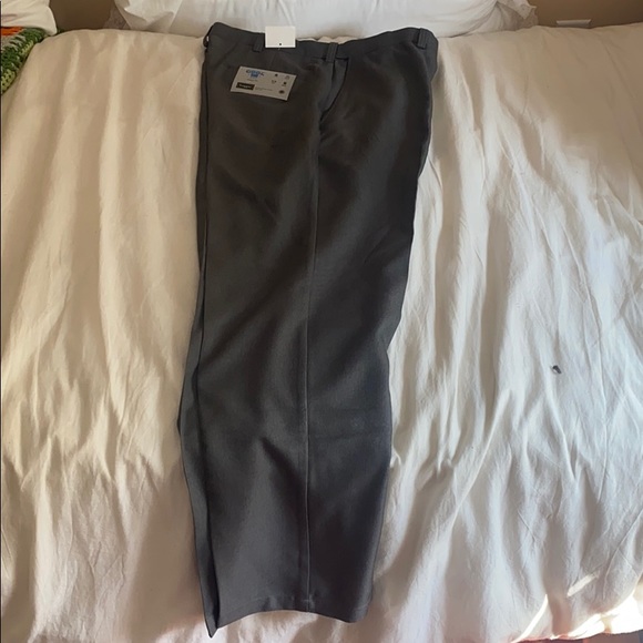 Grey slacks, wrinkle resistant, moisture wicking, machine washable, and a stretchy waist!!