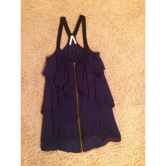 Cute blue and black tank. Zipper up the front with large ruffles, black racer back straps. Lightly worn.