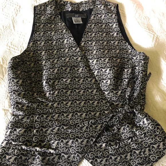 Check out the fabric! This is a lovely vest that ties in the front, to the side. Lined in black.