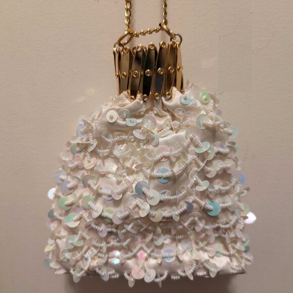 Lovely vintage purse made in Hong Kong, with an interesting closure. The gold-tone metal "collar" expands to open, and retracts to close. The chain is 12" long when doubled, or could be held singly for a 24" drop or could be concealed within the bag. Lining is satin as well,. The sequins are white iridescent, strung with tiny pearls and sewn onto the satin bag. Base is firm with support in lining, in a rectangular shape. This little beauty is about 6" high X 1-1/2" wide at the base. Perfect for parties, wedding, formal affairs.