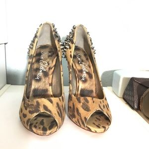 Fancy beige leopard open toe pumps w/ Studs