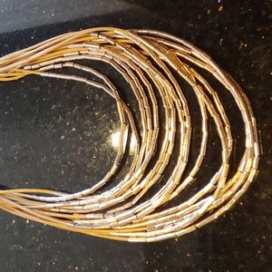 This necklace is super-cool and unique. Made with beading and cord, features a lobster class that allows for extending. Eye-catching and contemporary in its bold design. Dress up or down, can be anything from Bohemian chic to office fancy!