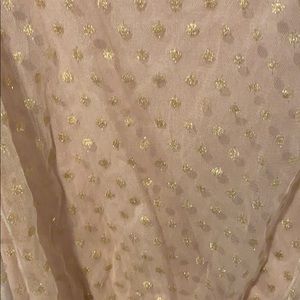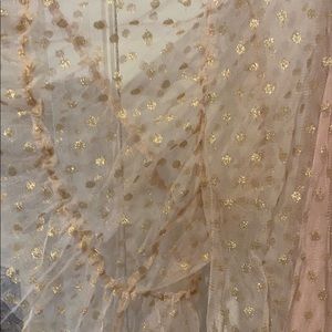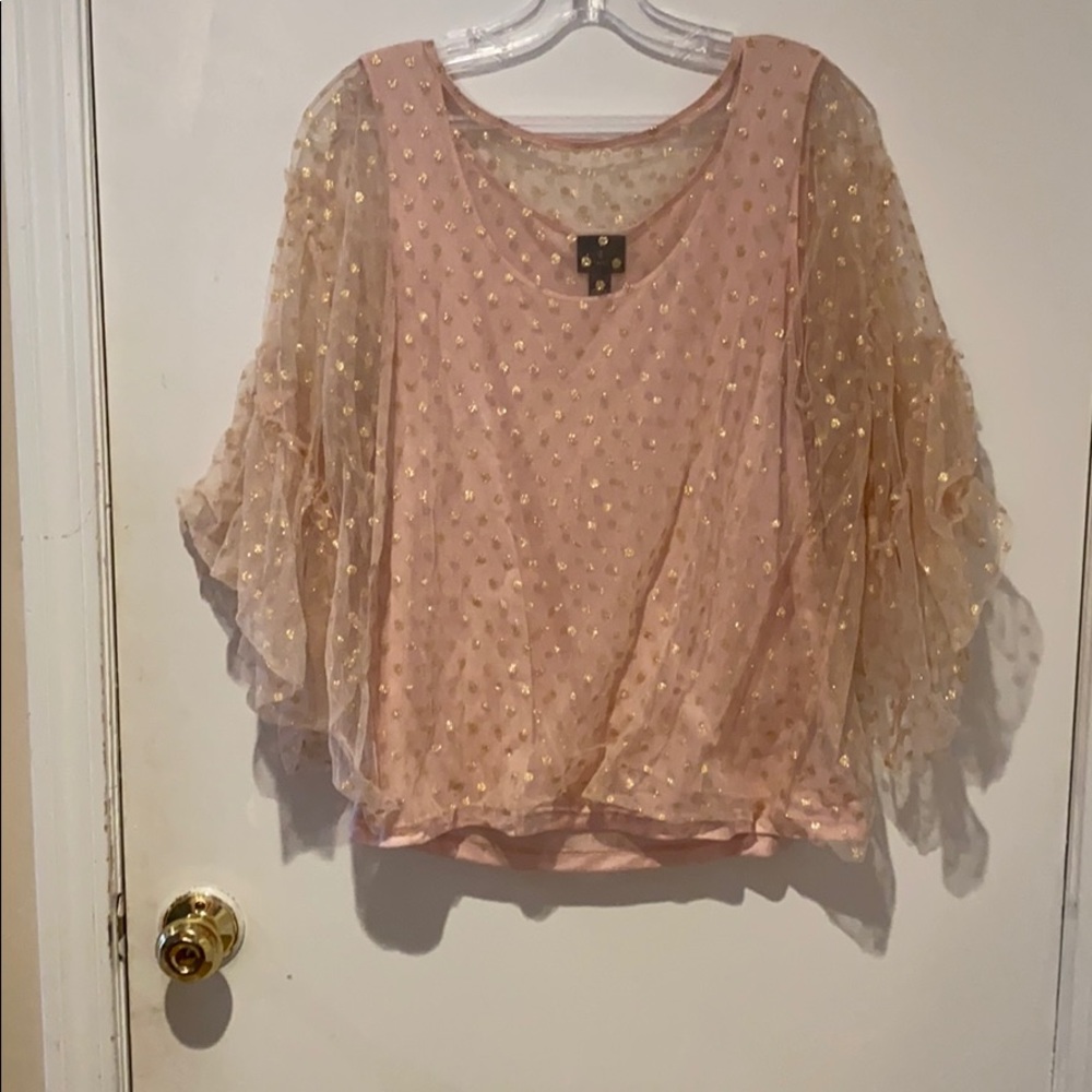 A 3/4 sleeve, sheer blouse with a built in tank top. The glitter is not rough at all. Has been worn twice. The sleeves are loose and do flow nicely.