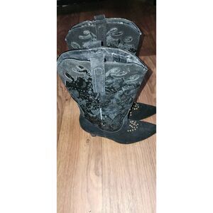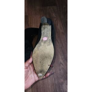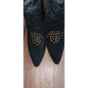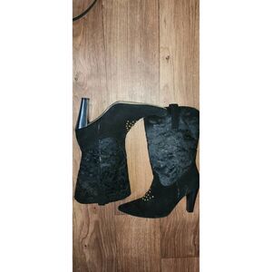 Beautiful combination of suede leather and pony hair boots amber stone embellishments on the toe. Apx 4" heel