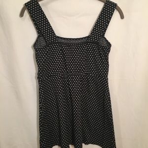 Black solid with small white heart pattern, long tank top with a roomy bottom and round belt embellishment