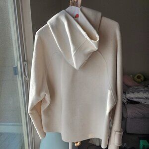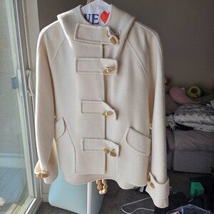 This luxurious off-white wool coat is designed for both style and comfort. Crafted from high-quality wool, it features a toggle front closure and a chic hood for a contemporary yet classic look. The coat's soft fabric and minimalist design make it versatile, perfect for both casual and formal outfits. With practical pockets and subtle toggle details, this coat combines functionality with a polished finish. Ideal for winter or cooler months, it’s a timeless addition to any wardrobe.