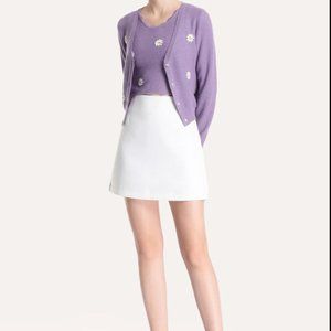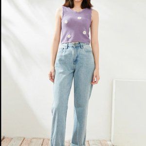 The cropped tank top has long sleeves, and the knitted pattern with daisy detail makes it extra special. The V neckline and straight silhouette provides an easy fit that goes great with jeans or leggings! Front daisy resin button closure. Unlined.