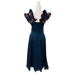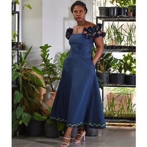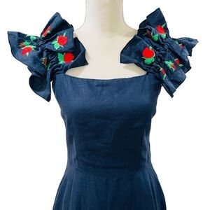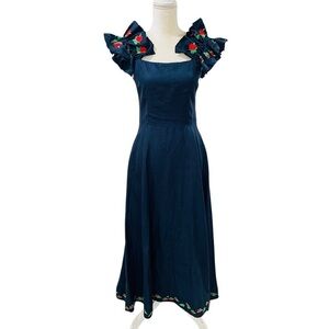 Fanm Mon Alanya On/Off-the-Shoulder Rose Embroidered Linen Midi Dress Indigo NWT