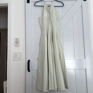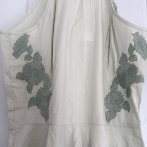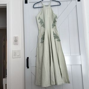 -Line Halter Dress with side pockets, back zipper closure, tie back at the neck with sophisticated floral side embroidery details.