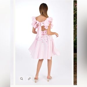 V Neck Mini Lightweight Cotton Dress. Featuring an empire waist with a low scoop back with self-tie bow side ruffle sleeves, hidden pockets, and floral embroidery detail. It's comfortable and lightweight, making it a great option for warm weather.