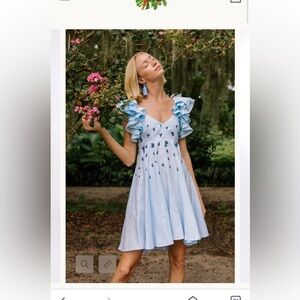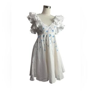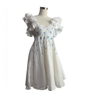 Featuring Ruffled flutter sleeves and embroidered flower details across the bodice