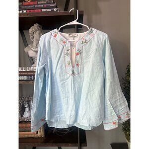 Fanm Mon Justina Linen Embroidered Ocean Blouse Light Blue Womens Size Small