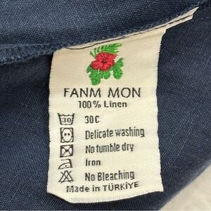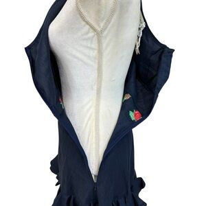 Fanm Mon Navy Flame Linen One Sleeve Ruffle Hem Floral Embroidery Mini Dress NWT