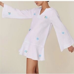 Mini Linen Embroidered Dress. Featuring V-neck, Long Bell Sleeves, flare skirt detail, and floral embroidery on the body.