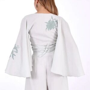 Beautiful top in like new condition. Featuring kimono sleeves and embroidery. Wraparound.