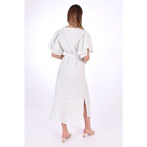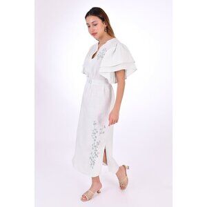 Ruffled Short-Sleeve Midi Dress. This effortlessly stylish cotton dress showcases floral-inspired embroidery, a detachable waist belt for a customizable fit, and side slits for ease of movement. Perfect for any occasion.