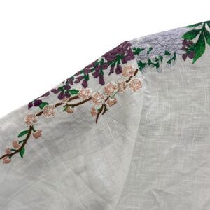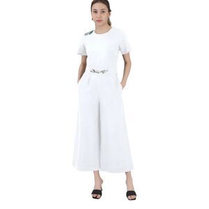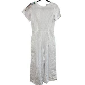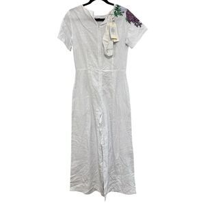 This Fanm Mon Bridgette jumpsuit is so chic! It's a size S and made from 100% linen in a beautiful white color. The jumpsuit features short sleeves, a wide leg with a cropped length, and a stylish belt to cinch the waist. The floral embroidery adds a unique and eye-catching detail.