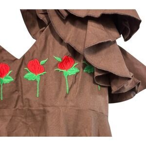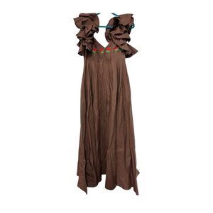 Absolutely stunning Fanm Mon Demre Embroidered Maxi Dress in a size small! This brown dress features layered ruffles at the shoulders and vibrant floral embroidery, ensuring you'll make a memorable impression wherever you go. It's in brand new and ready to turn heads!
