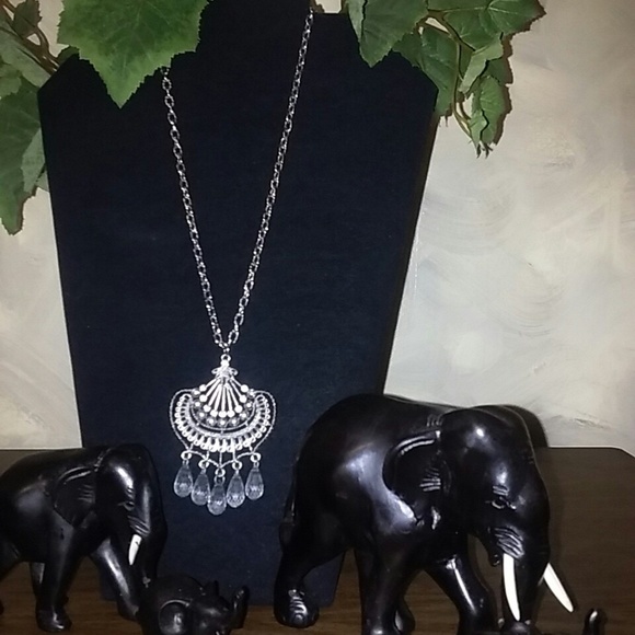 She is a 24" Necklace w/dangling chandelier beads, rhinestone in the fan. Chain necklace and charm is silver tone.