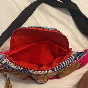 New Mexico Fanny bag with 2 zippers and shoe hanging in one zipper 12 long 6 wide with a 22 inches long strap