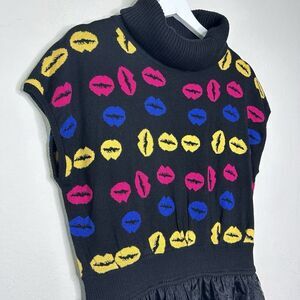 This Fanshy Luen sweater is a must-have for any fashion-forward woman. The colorful lips pattern adds a touch of whimsy to the black knit turtleneck, which is accented with lace and tulle details on the skirt. Lined with an elastic waist adds to the comfortable fit. The cap sleeve tunic style is perfect for any occasion, whether it's a casual day out or a party/cocktail event. The sweater is available in size 11 and is suitable for juniors or women. Make a statement with this unique and stylish piece! All measurements are approximate and taken flat with elastic at rest and NOT stretched.