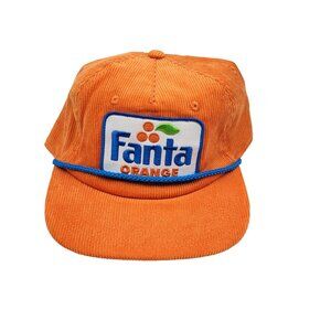 Features bright orange corduroy material with a large embroidered Fanta Orange patch on the front, accented with a blue trim rope along the brim.
