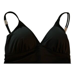 Very nice one piece swimsuit, black, size 10. The ruching across the midriff is very flattering,and it has a short skirt in front. The back is full coverage. Padded bust for support.