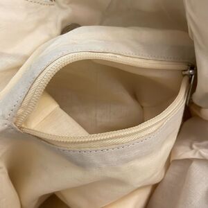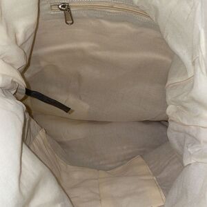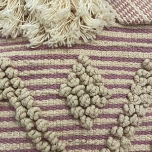 Purple, pink and cream striped woven tote, shoulder bag with a knotted geometric pattern and tassels by Fantasia Accessories. I have also found the same bag and RN # being sold under the brand Twig & Arrow. Cream lining with a zippered interior pocket and snap closure. Approximate measurements shown in photos. The purse has no signs of wear. In excellent pre-owned condition with little to no signs of use.