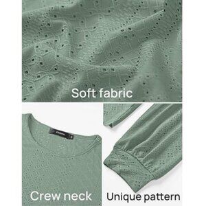 This womens top features puff long sleeves, crew neck, solid color, loose fit, business casual style, and eyelet design.