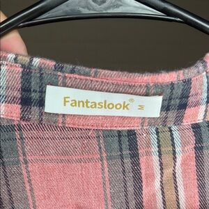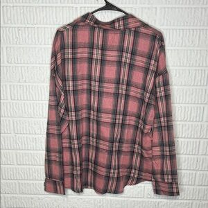 Stylish pink plaid button-up shirt with a classic collar and long sleeves. Perfect for casual wear.