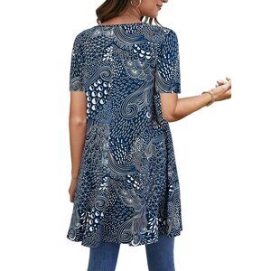 Features: Casual and dressy options; round-neck, short sleeves; flare, loose fit; covers belly and hips; flared hem for a flattering look.