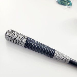 This Wizarding World (Warner Bros.; Harry Potter) piece is from the Fantastic Beasts movie series. This is a Fantastic Beasts Mystery Wand: Magical Creatures Series, Leta Lestrange wand (silver and black with swirled bottom shaft). The set also comes with a wand stand, the box, and a Bowtruckle magical creature icon.