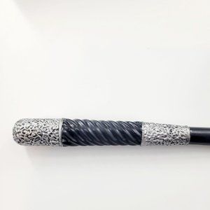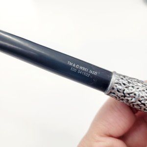 This Wizarding World (Warner Bros.; Harry Potter) piece is from the Fantastic Beasts movie series. This is a Fantastic Beasts Mystery Wand: Magical Creatures Series, Leta Lestrange wand (silver and black with swirled bottom shaft). The set also comes with a wand stand, the box, and a Chupacabra magical creature icon.