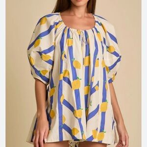 Fantastic Fawn Lemon Print romper with Blue Stripes small