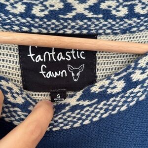 Gorgeous piece by Fantastic Fawn in like new condition. This navy blue knit poncho sweater features bold Aztec-inspired patterns on the sleeves, fringe trim along the hem, and ribbed cuffs for a cozy, boho-chic vibe.