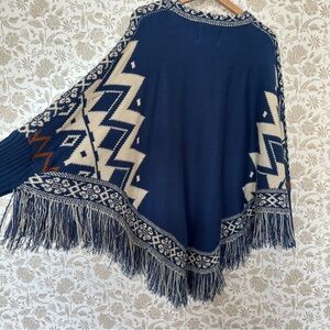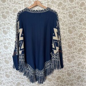 Fantastic Fawn Navy Fringe Poncho Sweater Aztec Knit Size S