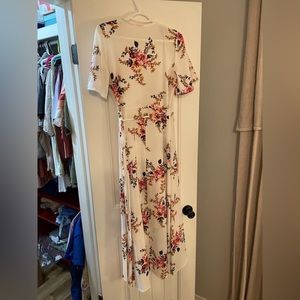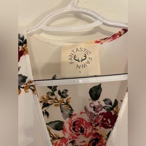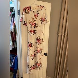 Fantastic Fawn size large. True wrap dress. Easily fits a medium/large. Midi length. Not lined. True white with floral details. Very light summer fabric. Perfect for a bridal shower or Easter!