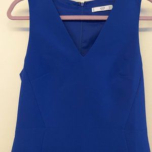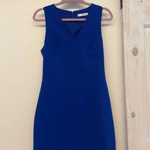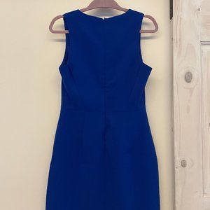 This dress is the most gorgeous blue -- it looks absolutely like new and the color is crisp and flawless. Flattering v-neck and structured beautifully for a flattering fit. really a fantastic dress for anything from date night to officewear with a blazer. Only giving it up because it's a size too small for me!