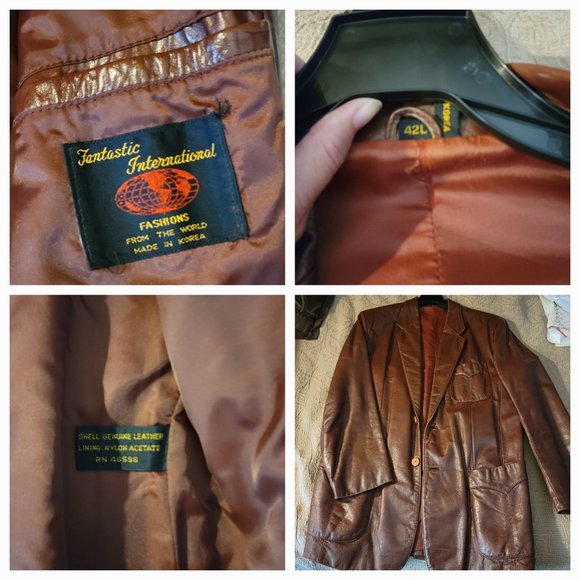 Fantastic International genuine leather suit jacket in brown with nylon lighter color lining. Made in Korea.