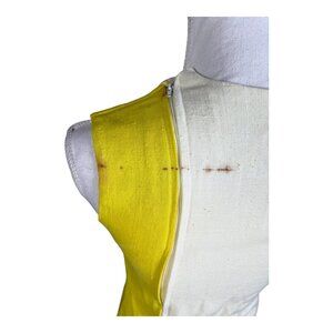 Playful yellow block on one side of the dress with the zipper following the yellow fabric on the back (off-center). Adorable applicated daisies and there is one front pocket.
