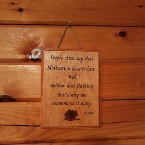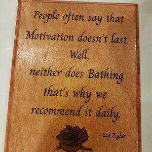 Mushland engraved for you a motivational home decor wall hanging with inspiration by Zig Zigler. Our solid wood plaque “People often say motivation doesn’t last. Neither does bathing that's why we recommend it daily.” was written by a world-class motivator and speaker. We had to bring it to you as a daily reminder, for your home or as a gift for someone you love, give the gift of success! The wall hanging is 12x9 inches. Done in a pretty colonial maple stain with a Jute hanger on the back.