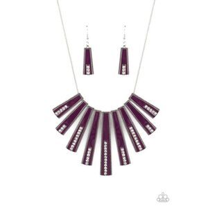 Encased in daintily dotted silver frames, a row of flared silver bars painted in a glossy purple, fans out across the collar. A column of sparkling white rhinestones rises from the bottom of each frame, creating a dramatically deco finish as they sway from a round silver chain. Features an adjustable clasp closure.