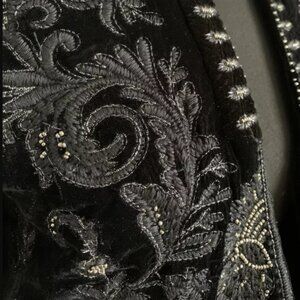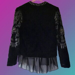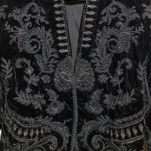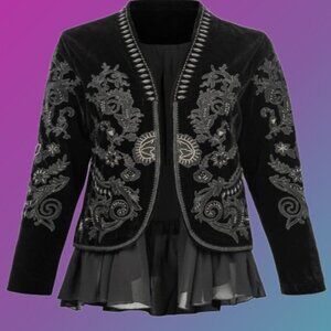 Fantasy Chiffon Ruffles Floral Embroidered Beading Black Velvet Jacket Sz M
