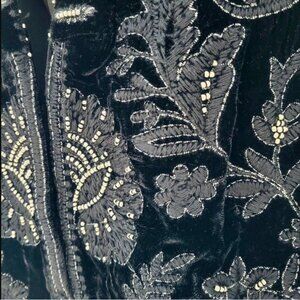 Pyramid Collection elegant black velvet jacket adorned with tonal and lurex embroidery, gorgeous floral beading details and chiffon ruffles cascading the open front and hemline. With every step you take the ruffles move gracefully, an expression of fantasy and romantic spirit. Polyester Hand wash cold water. Excellent condition. Bust 41 Inch Length 21 Inch plus Ruffle 6 Inch. Labeled Size M