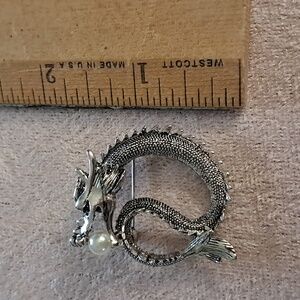 Beautiful Silvertone dragon brooch. Holds a faux pearl in it's mouth.