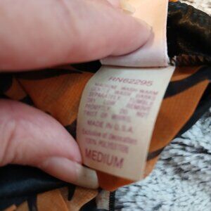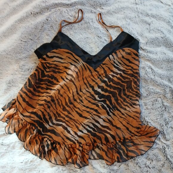 Features: tiger print, black band at v neck line, ruffle at bottom, pull over style, spaghetti straps, made in USA, semi sheer
