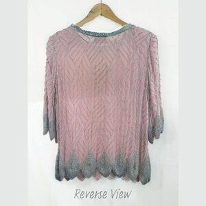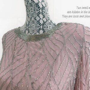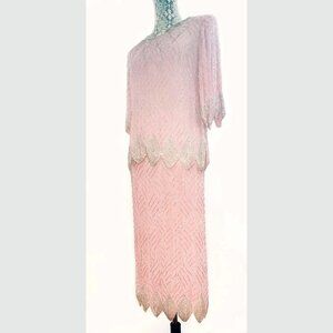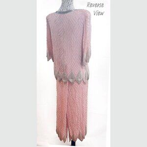 Soft pink, silver-tone beaded chiffon over a silk bodice and straight skirt with scalloped hems on top, sleeves and skirt.