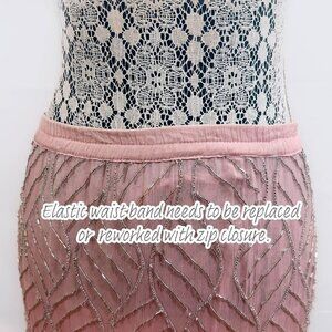 Skirt has a 10 inch slit in the back and has an elastic waistband that needs replacing since it's elasticity has worn and released over time. Alternately the band could be altered and replaced with a zip closure.