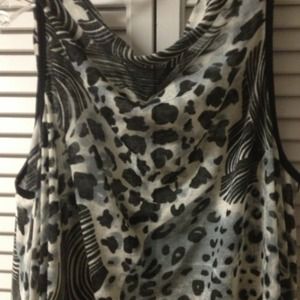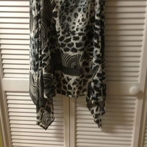 This fabulous animal print vest is so unique with the asymetrical hemline and looks great over a back dress or with skirt or pants. A very stylish look that can be dressy for a night out or with black jeans for a more casual look.