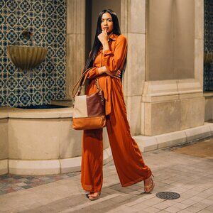 This modern brown handbag has a clean, elegant silhouette and durable brass hardware.